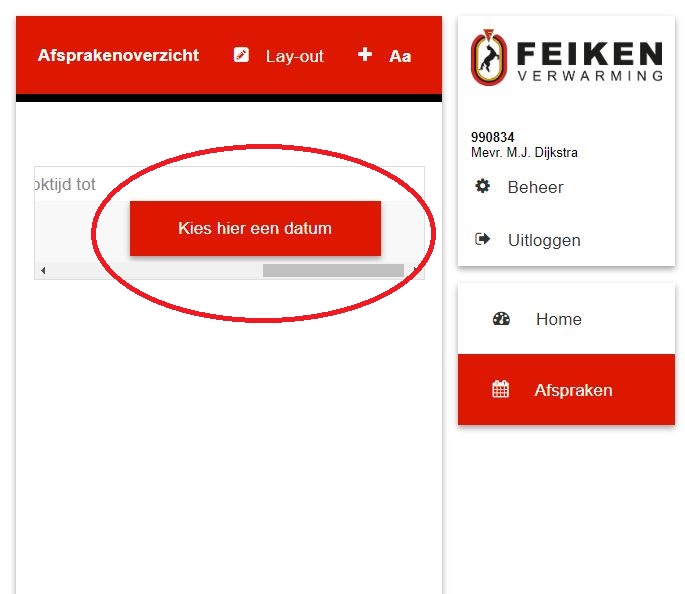 Als je naar links geswipt hebt zie je de afspraak knop staan, “kies hier een datum”